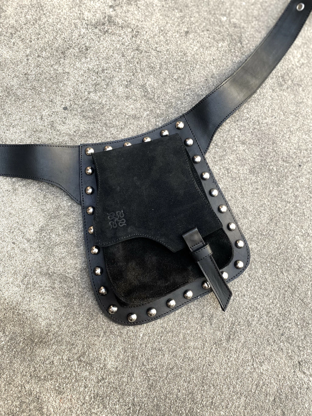 Estilo y practicidad, esta bandolera combina cuero y gamuza en un tono negro. Formato compacto y versátil permite llevarla cruzada al torso o a la cadera.