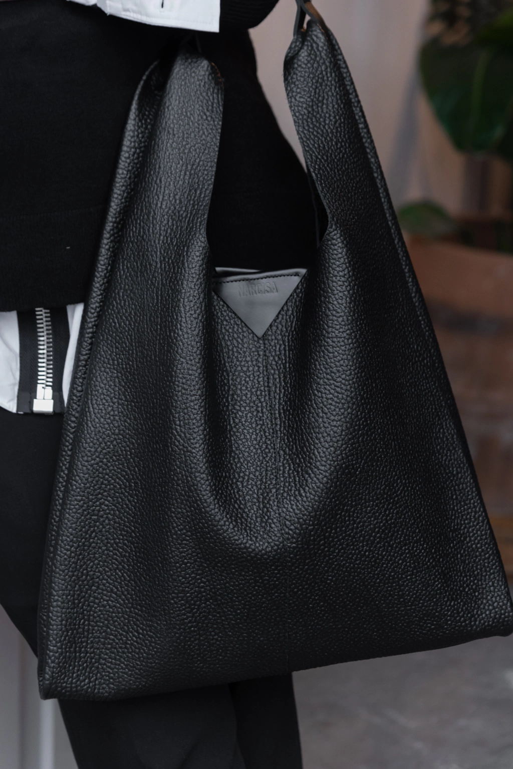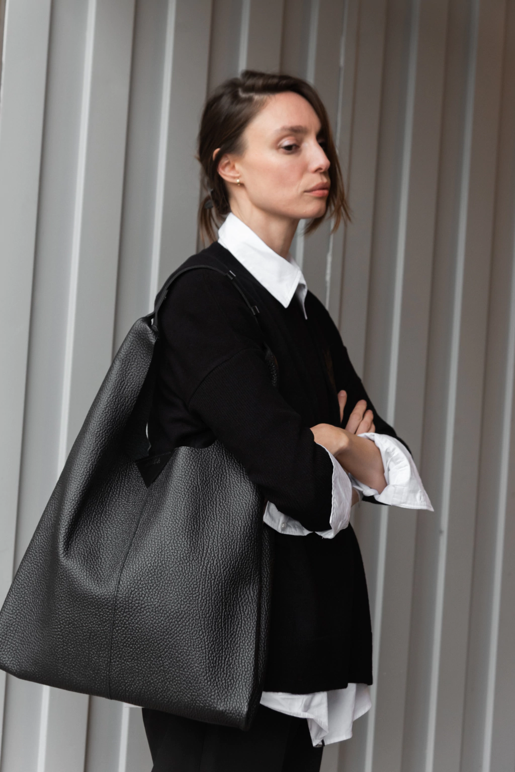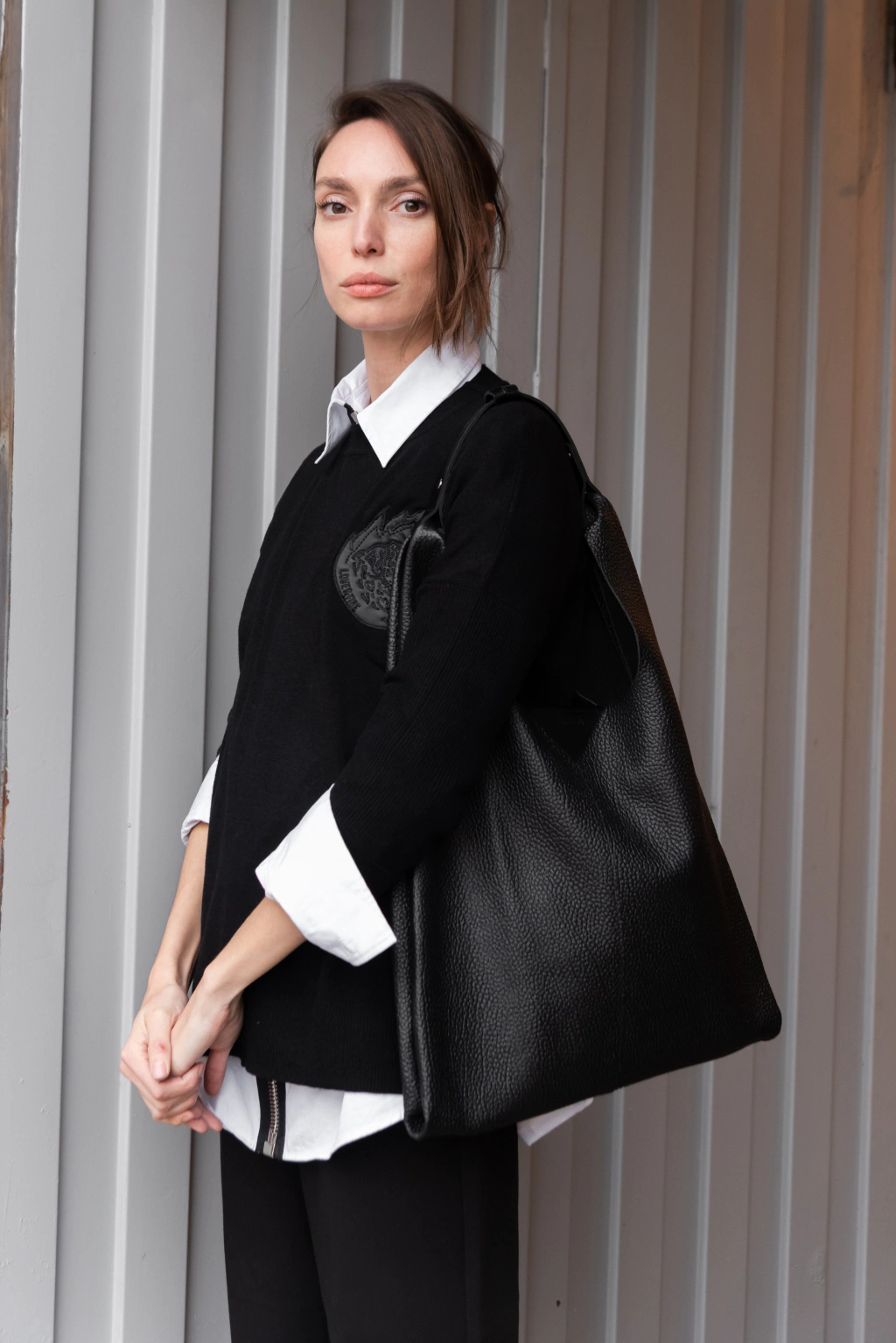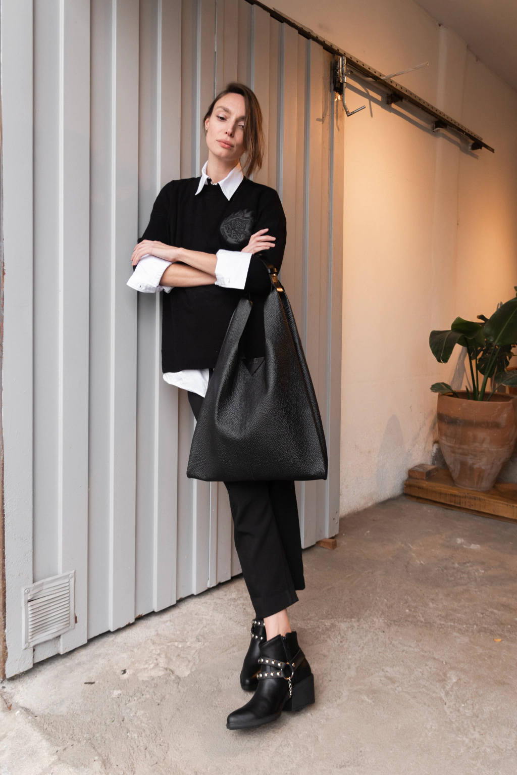 Bolso de cuero graneado blando, simple y cómodo, con capacidad perfecta para llevar todo lo que te hace falta: compu, cuadernos, agendas, botella, etc. Super versátil, ideal para llevar a la facu y la oficina. Sistema de apertura con broche imán. Incluye neceser interno con cierre.