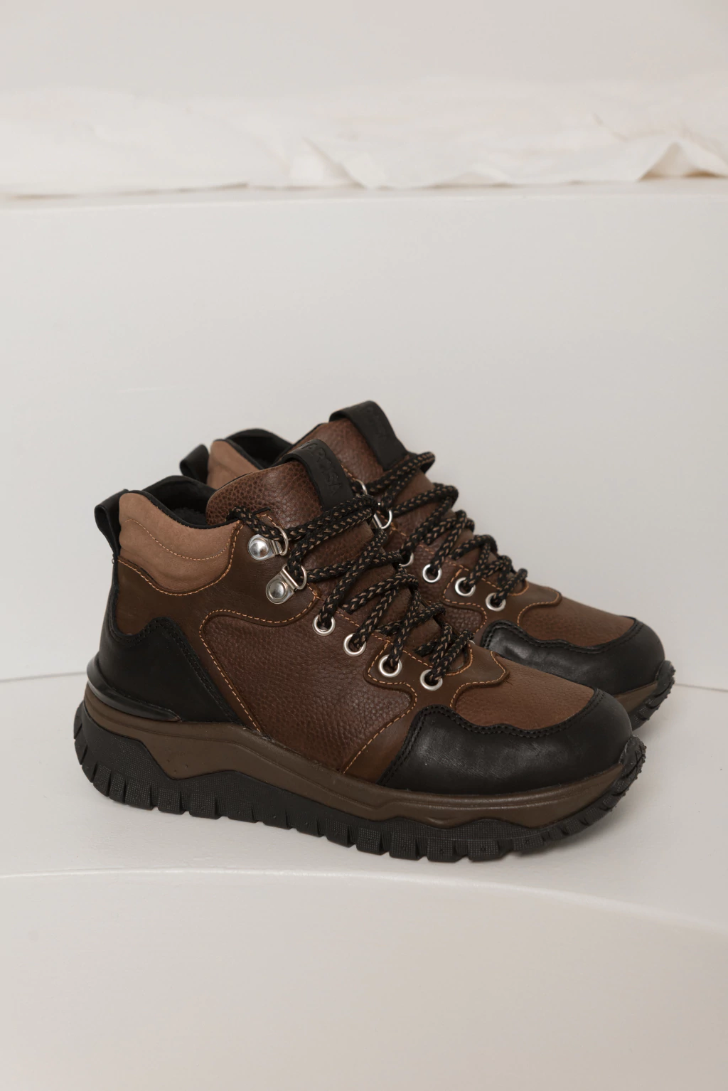 Borcego estilo trekking acordonado con combinación de distintos cueros, todos en tono chocolate .