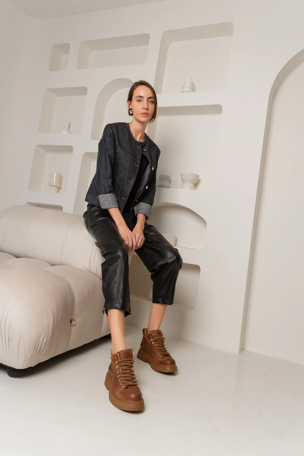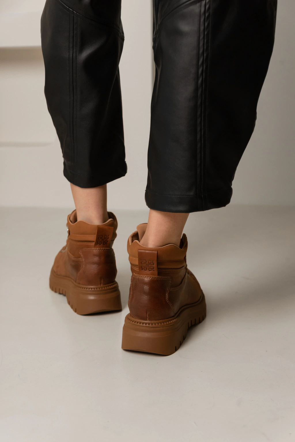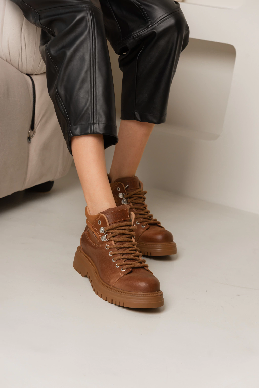 Borcego acordonado con combinación de distintos cueros, todos en tonos suela.