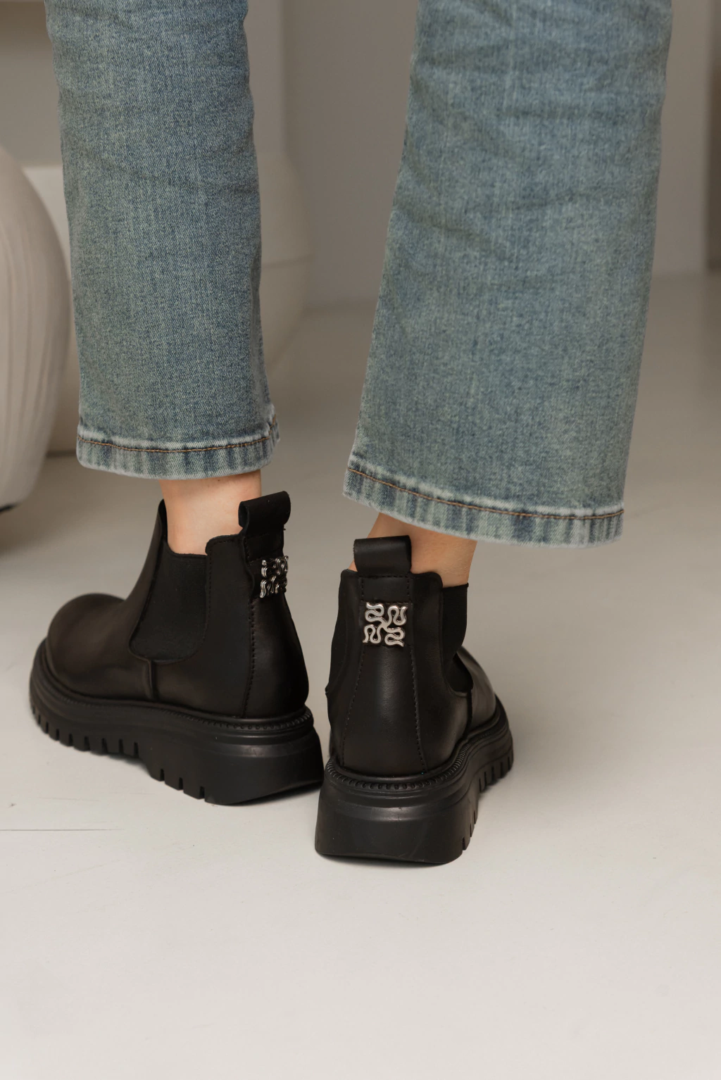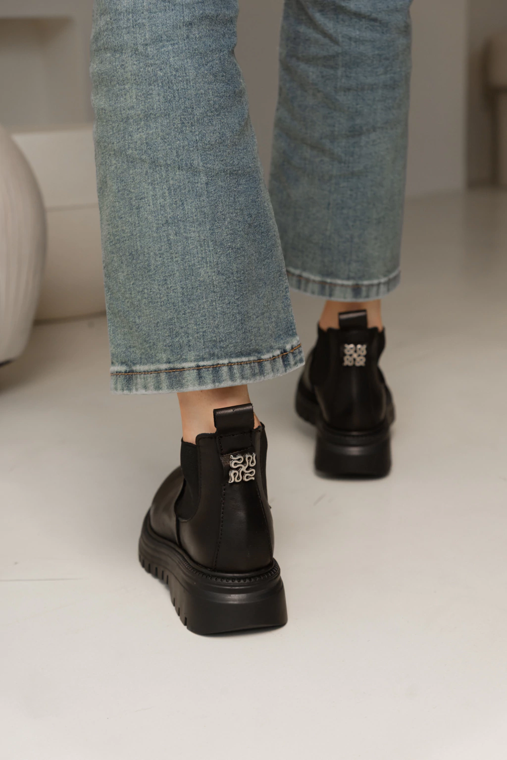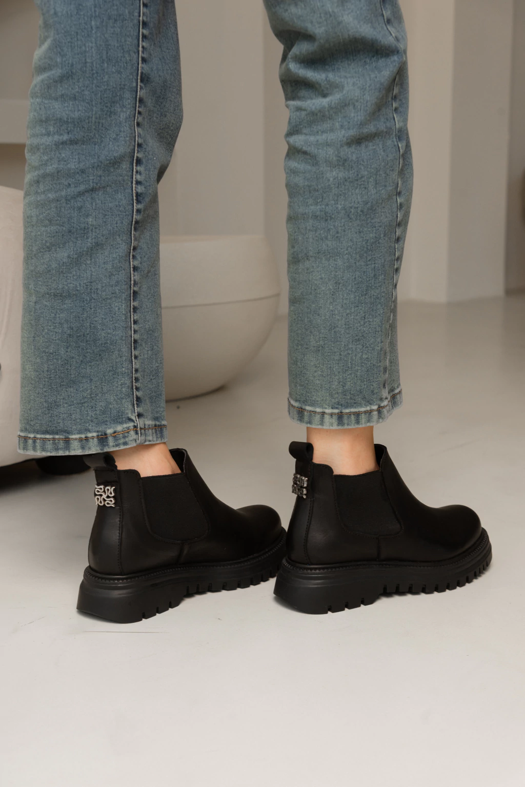 Bota corta de cuero color negro, con elástico en sus laterales. Detalle de agarre en talón con hebilla.