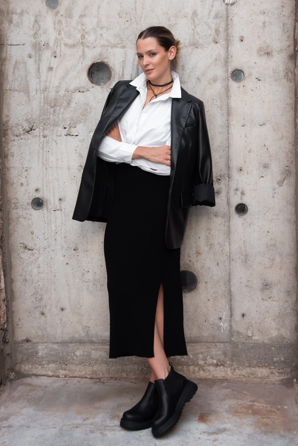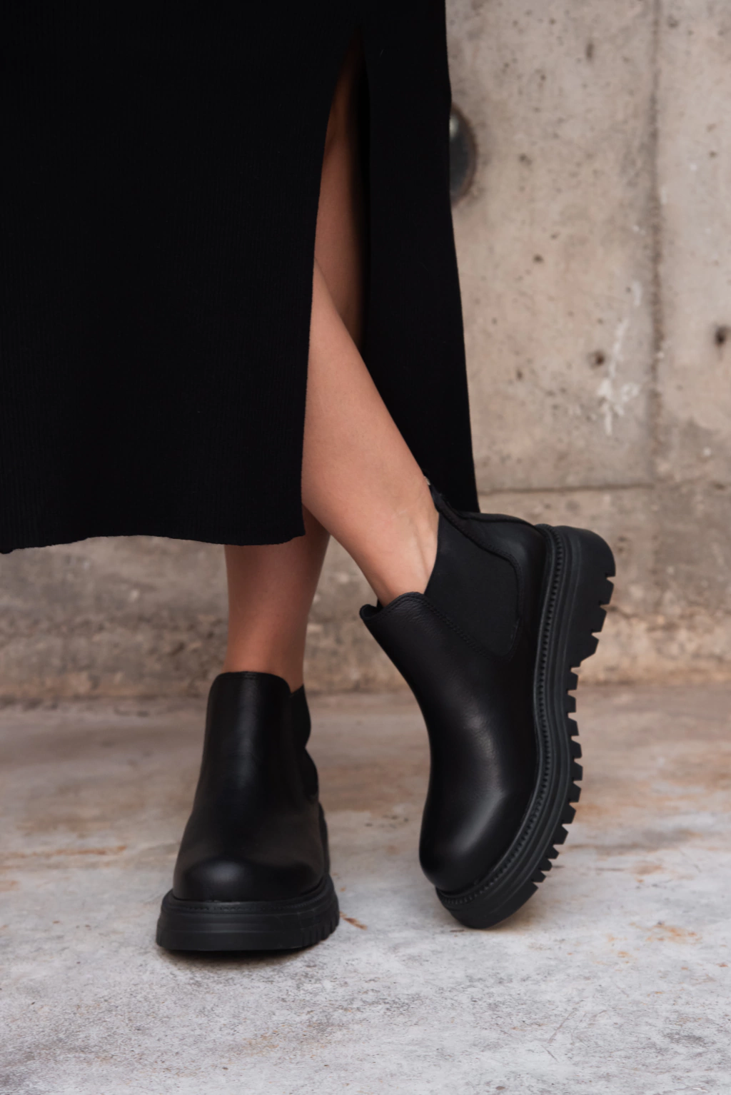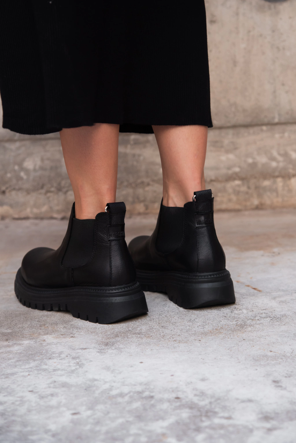 Bota corta de cuero color negro, con elástico en sus laterales. Detalle de agarre en talón con hebilla.