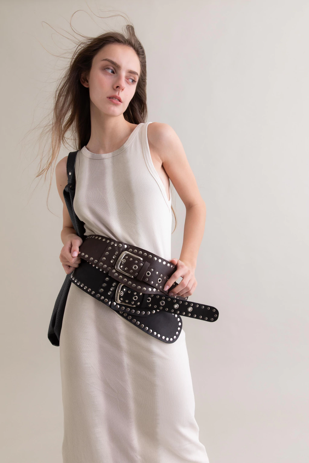 Cinturón faja de 8 cm de ancho. Detalle aplicación de tachas.