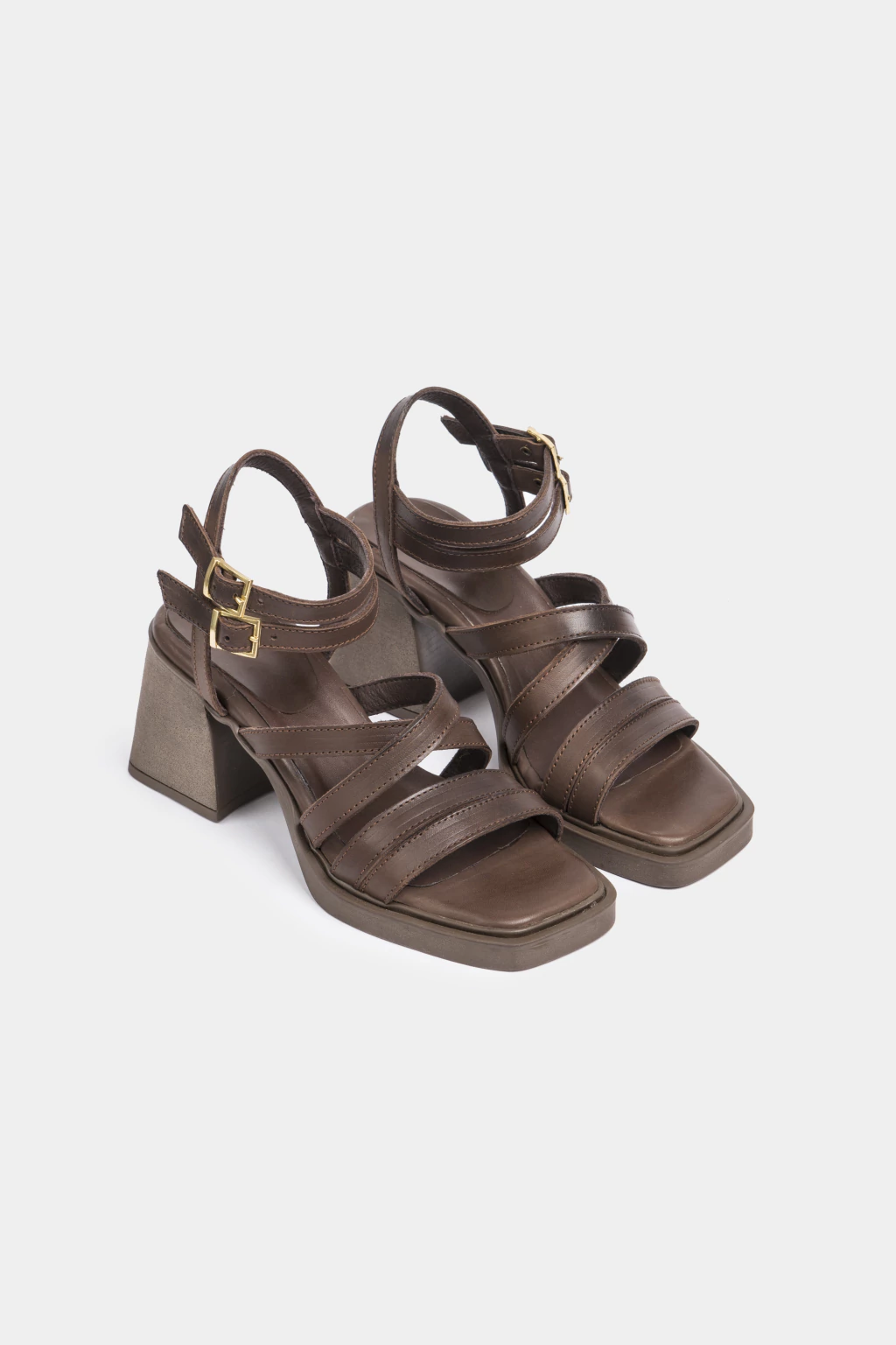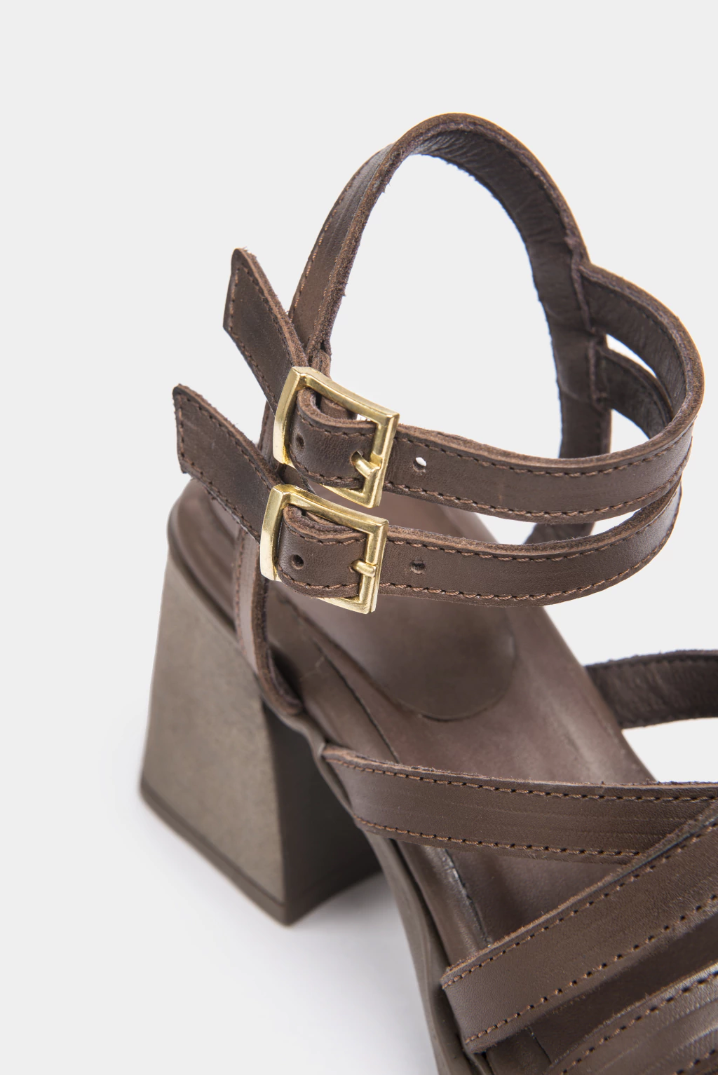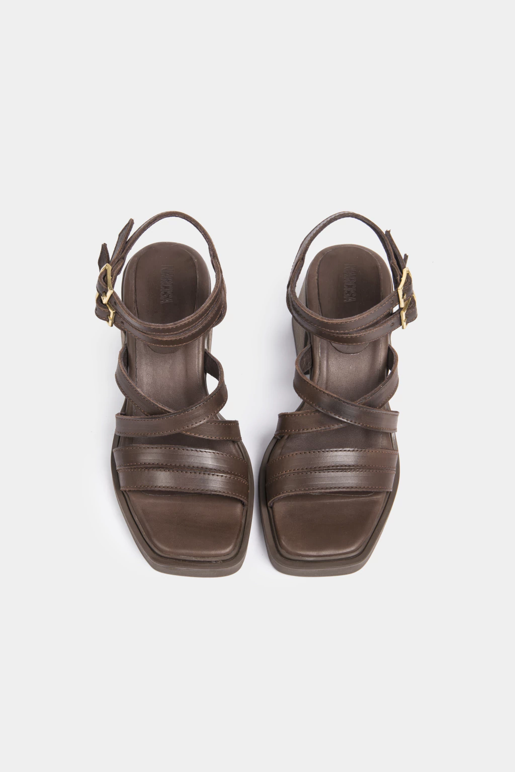 Sandalia de cuero chocolate, en su apellada cuatro tiras, dos de ellas cruzadas, que enmarcan el pie con estilo.