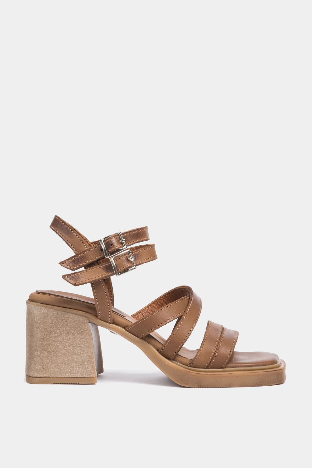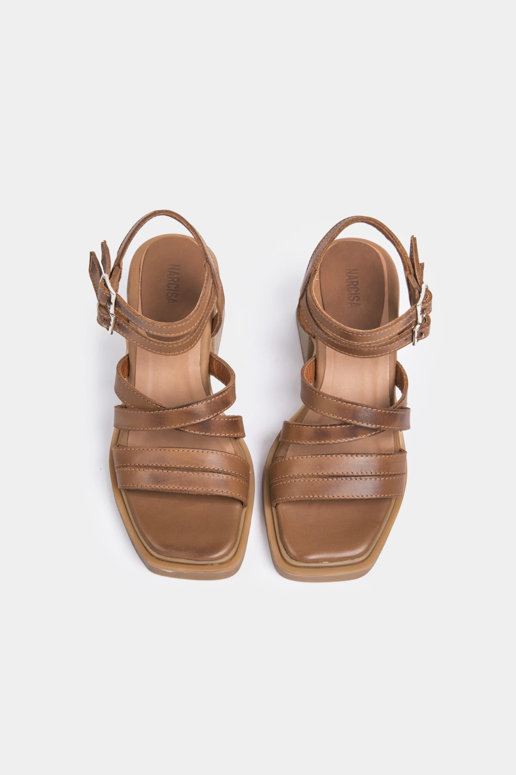 Sandalia de cuero color suela, en su apellada cuatro tiras, dos de ellas cruzadas, que enmarcan el pie con estilo.
