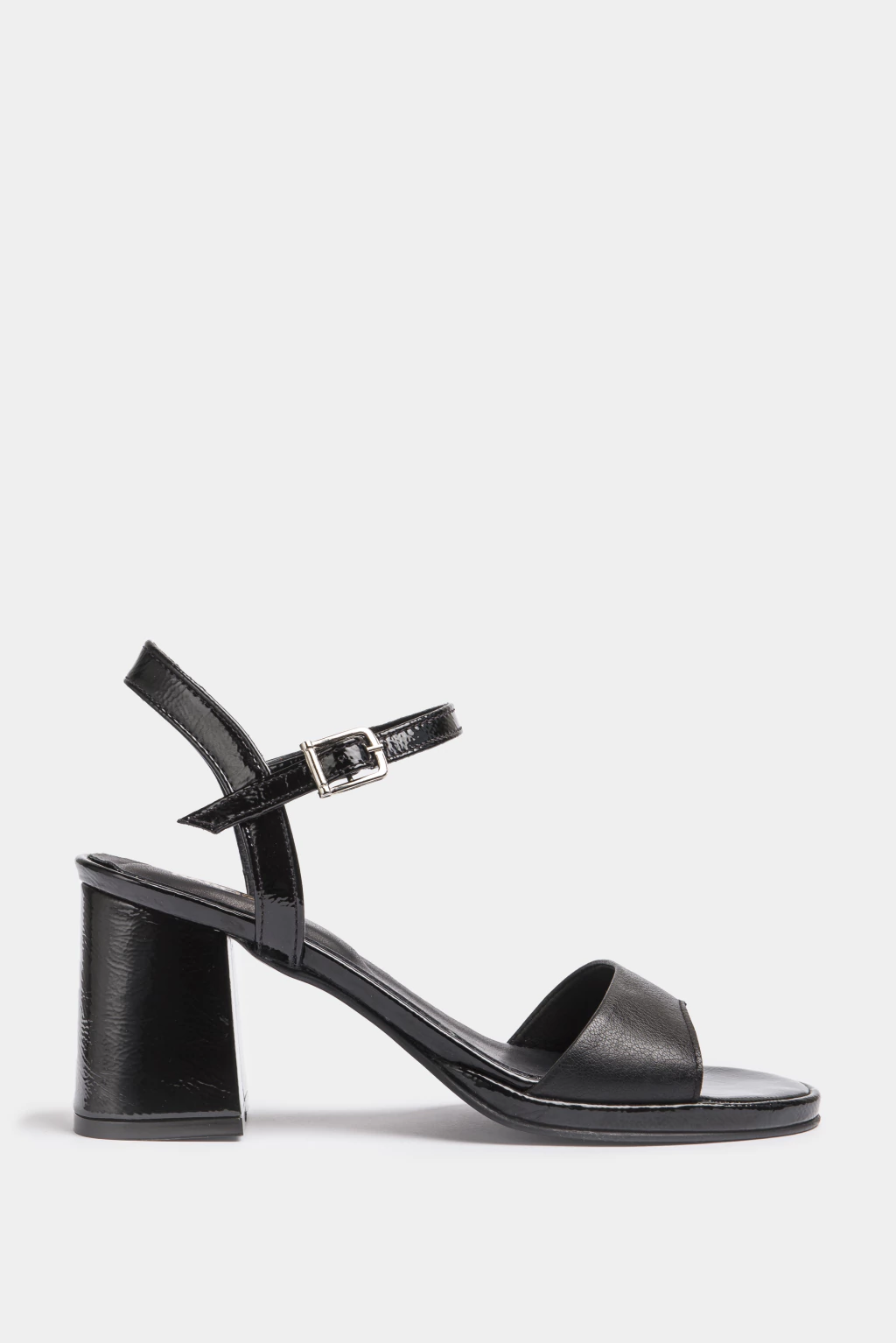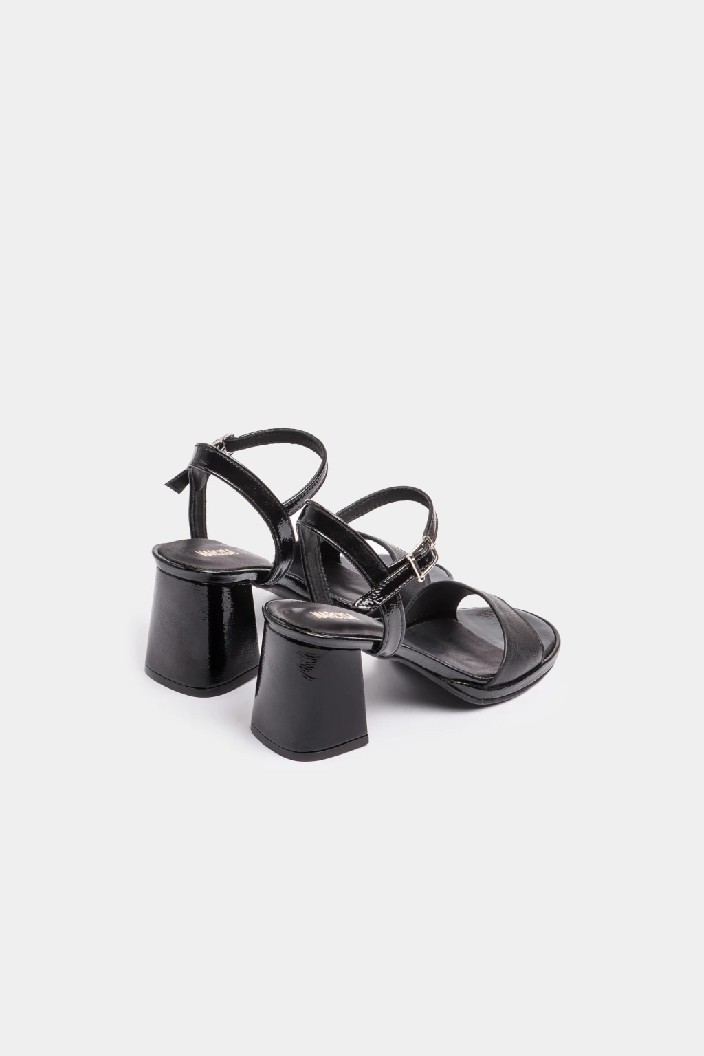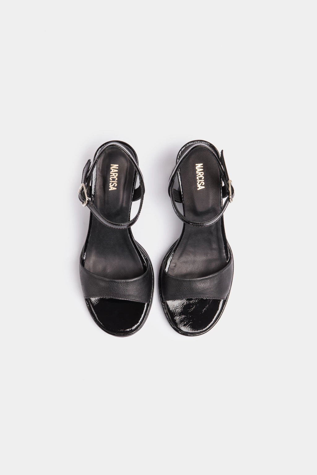 Sandalia de cuero negra. Taco y base de charol. Taco de aproximadamente 8,5 cm. Ideal para ocasiones más arregladas o de fiesta.
