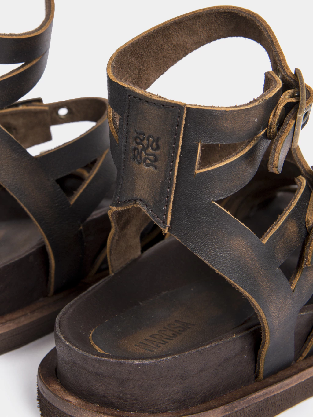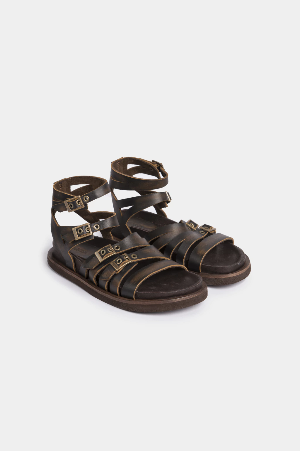 Sandalia estilo romano de diseño cómodo y versátil con tiras de cuero chocolate que se ajustan perfectamente al pie gracias a sus hebillas metálicas. Pulsera al tobillo del mismo material, también con hebilla regulable para mayor sujeción.