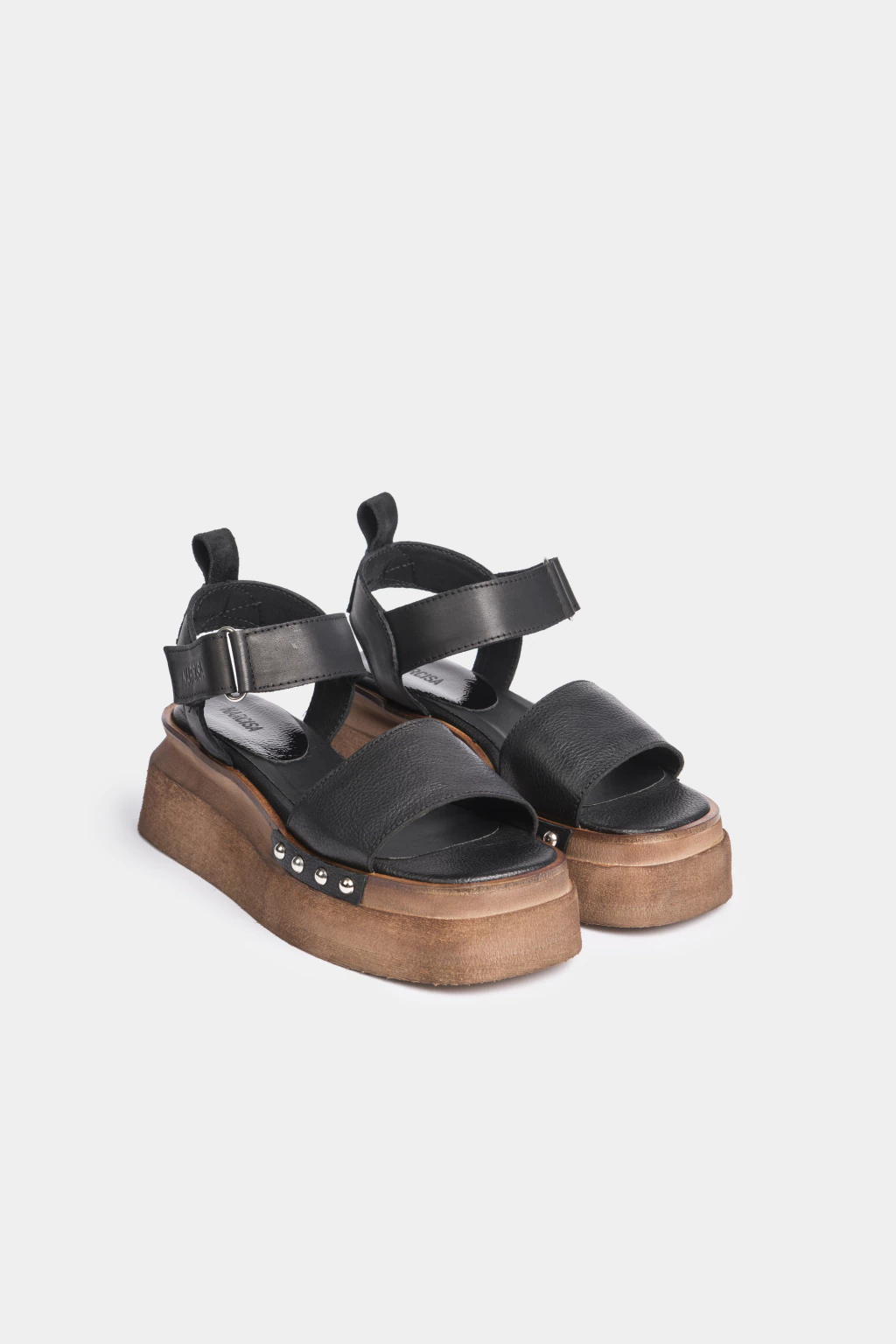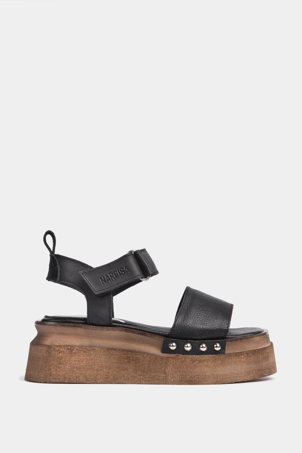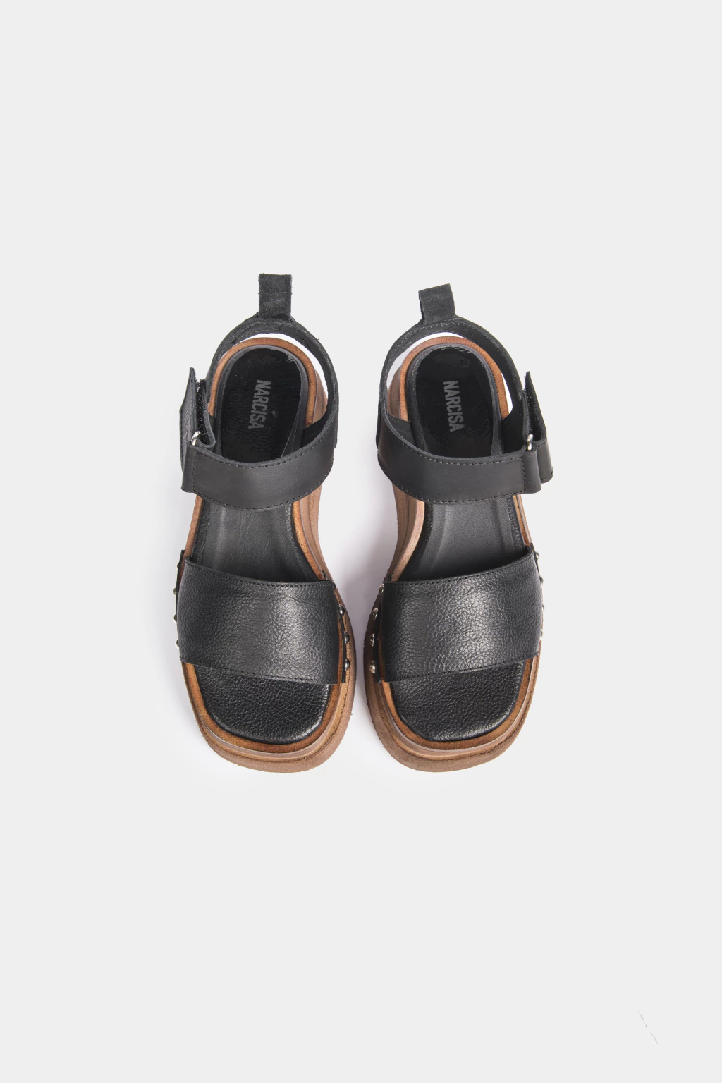 Sandalia de cuero color negro con base de eva liviana, de 6 centímetros en la parte más alta y 4 centímetros en la delantera.Tira ancha en la capellada y pulsera con abrojo en el tobillo. Tachas en los costados de la base como detalle.