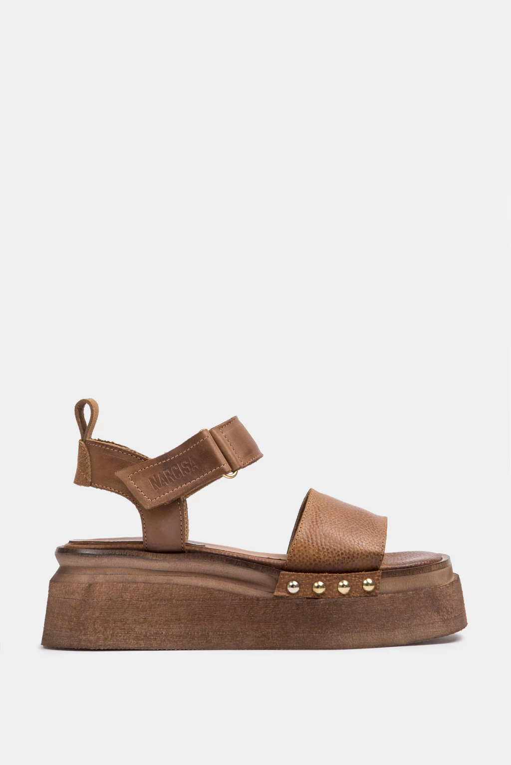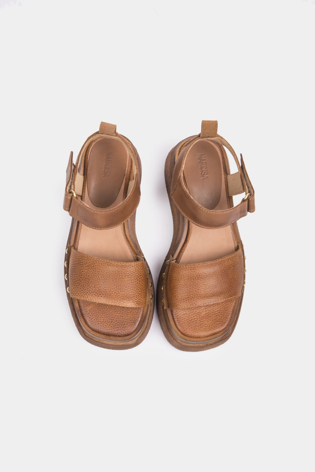 Sandalia de cuero color suela con base de eva liviana, de 6 centímetros en la parte más alta y 4 centímetros en la delantera.