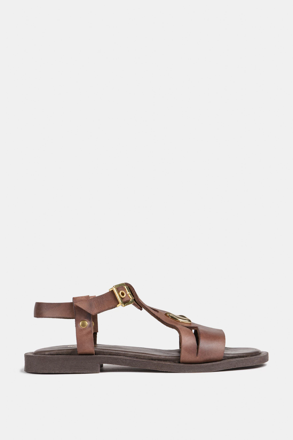 Sandalia de cuero color chocolate con suela de goma flexible y taco de 2 cm aproximadamente. Su capellada cuenta con un elegante cuero calado y un aplique dorado en el centro. Se ajusta mediante una hebilla en el costado para un calce seguro.