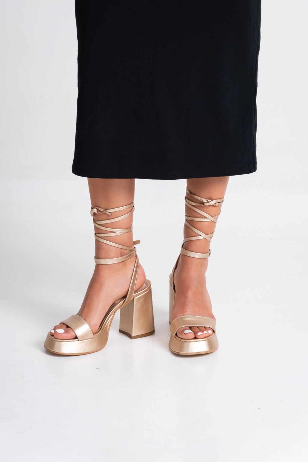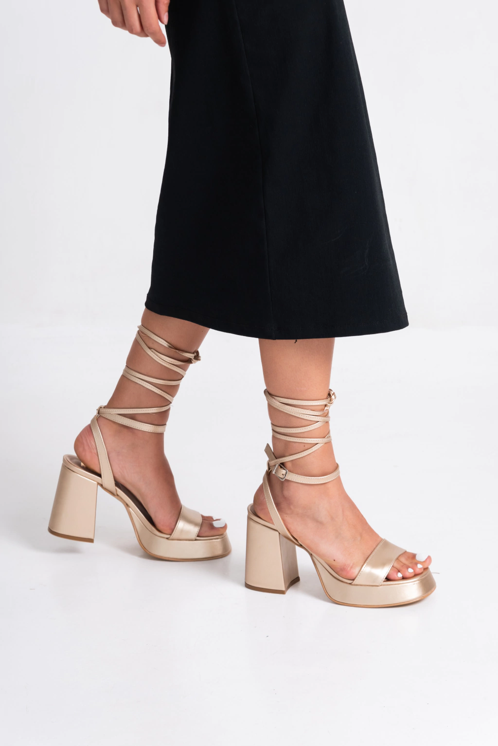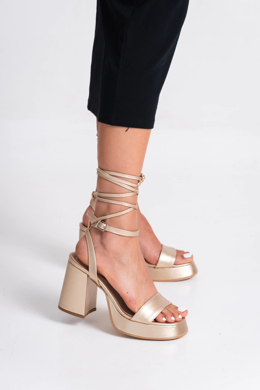 Sandalia color oro suave, modelo de fiesta. A la altura de tobillo tiene como sistema de cierre hebilla y tiras que se atan en la pierna, ambos son accesorios, se puede usar uno u otro, o ambos.