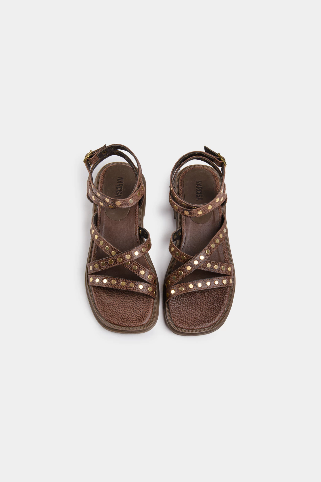 Sandalia de cuero color chocolate con suela de goma flexible y taco de 3 centímetros aproximadamente. Su capellada cuenta con tres tiras de cuero con detalle en tachas, y una tira en el tobillo que se cruza y es regulable con hebilla, también con detalles de tachas.