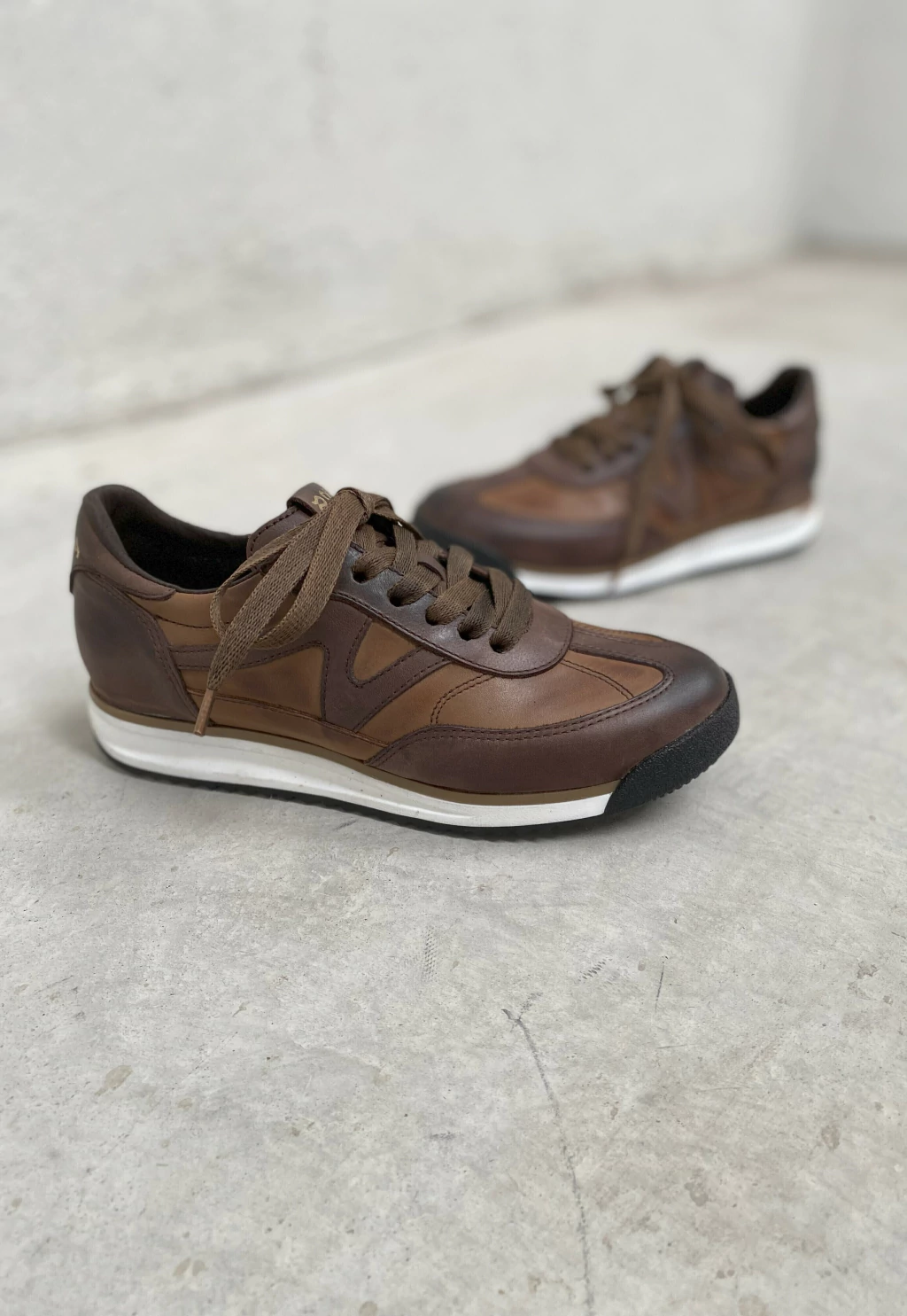 Zapatilla acordonada de cuero color chocolate. Detalle de recorte en lateral color chocolate.