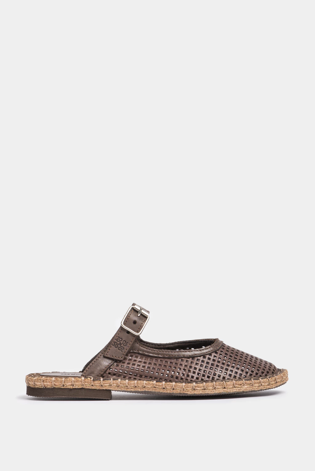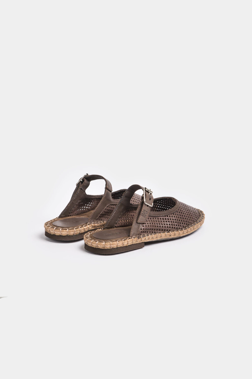 Detalle de hebilla metálica en la capellada y base de eva ultraliviana de 2 centímetros en su parte mas alta, con terminación en yute natural.