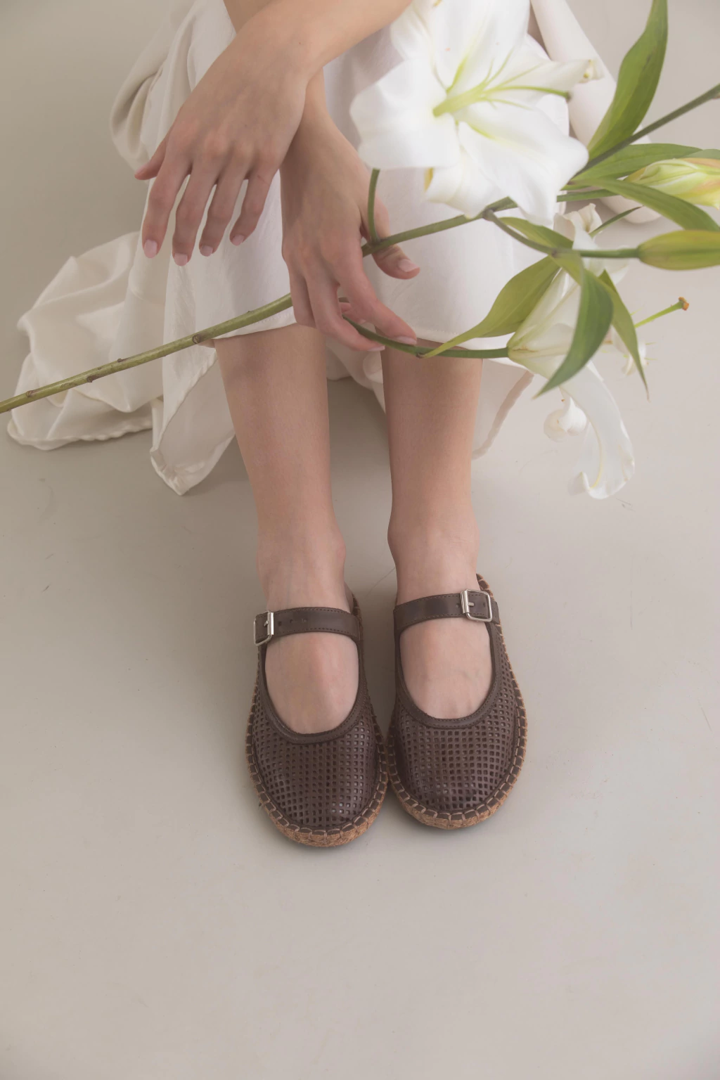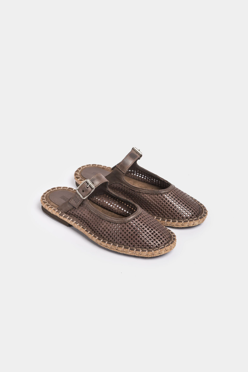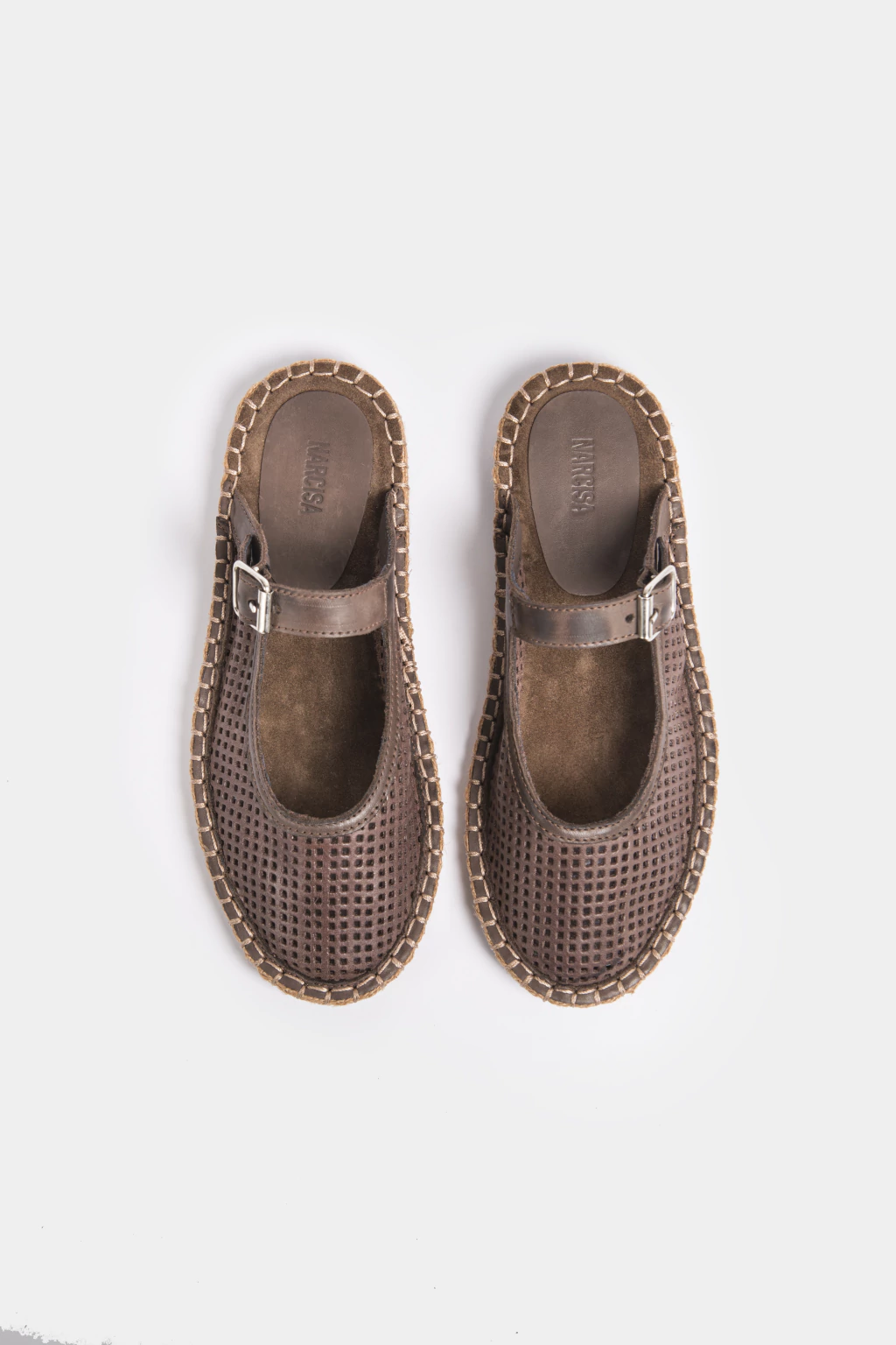 Zueco de cuero chocolate calado estilo red, con diseño liviano y fresco.