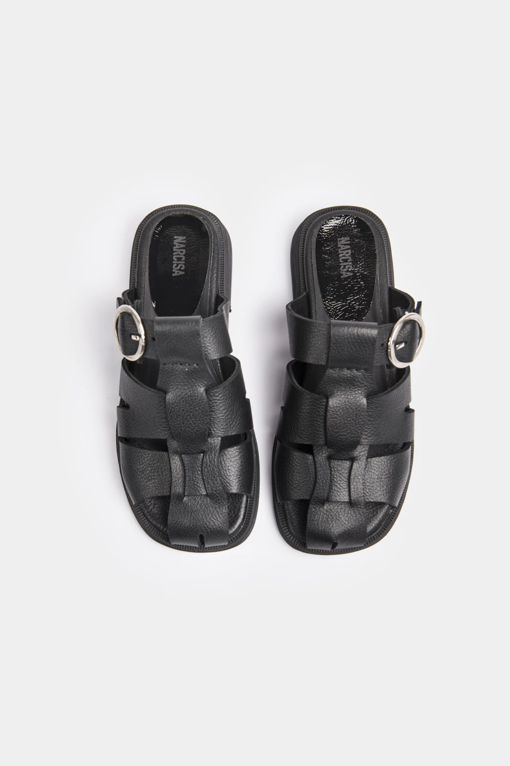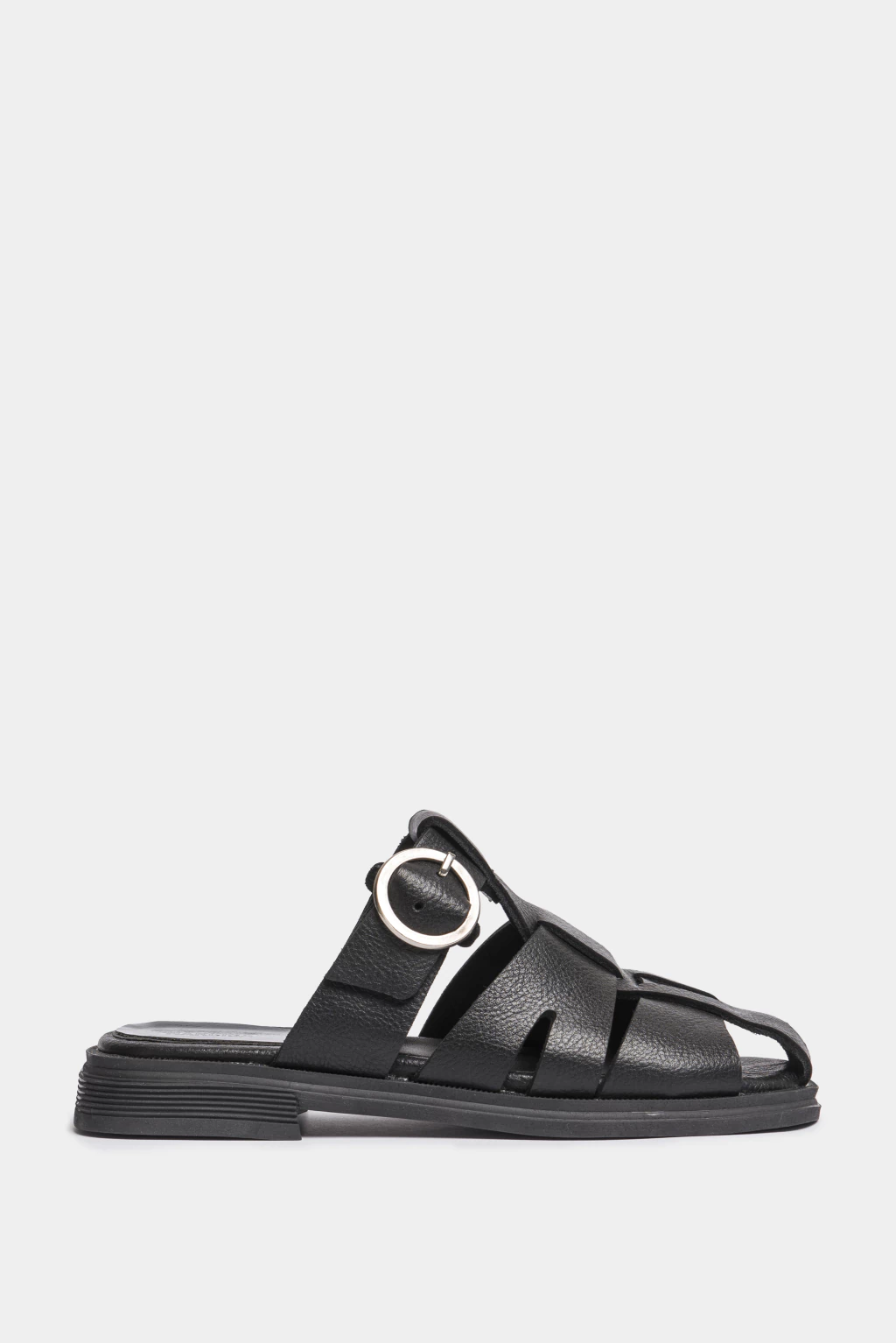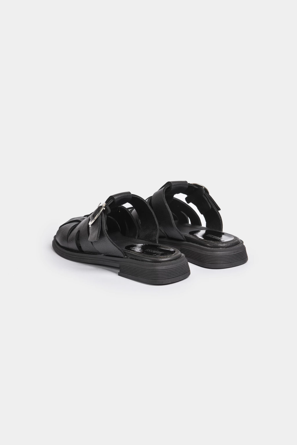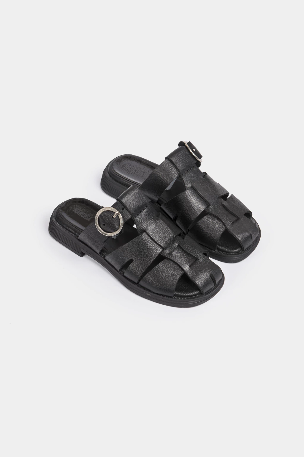 Zueco de cuero negro con diseño calado en tiras que aporta frescura y personalidad. Cuenta con hebilla redonda regulable para un calce práctico y base de en su parte más alta y en la mas baja. Ideal para un look relajado y con estilo.