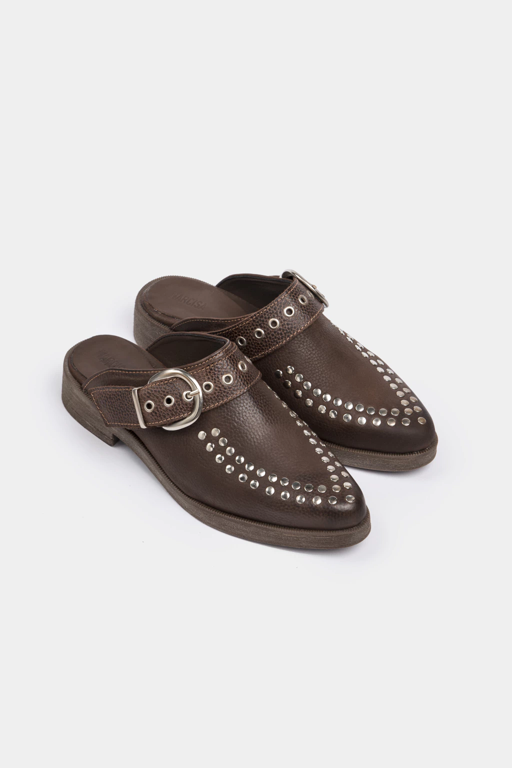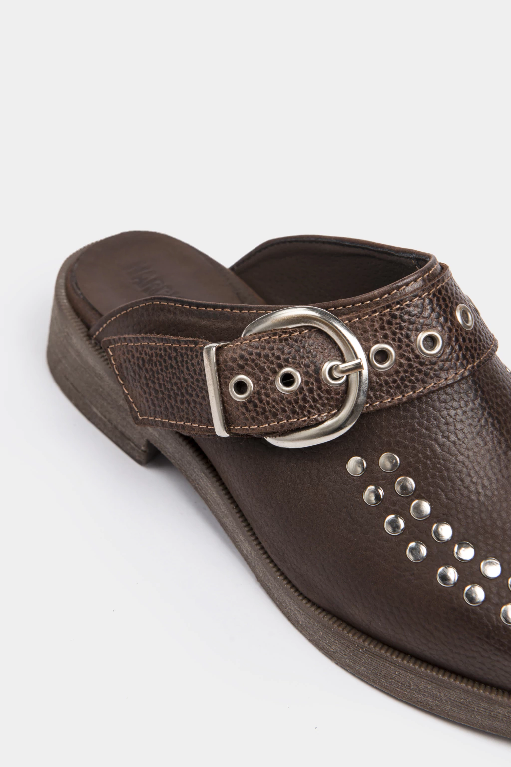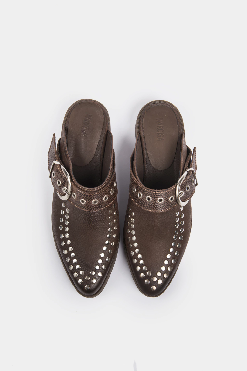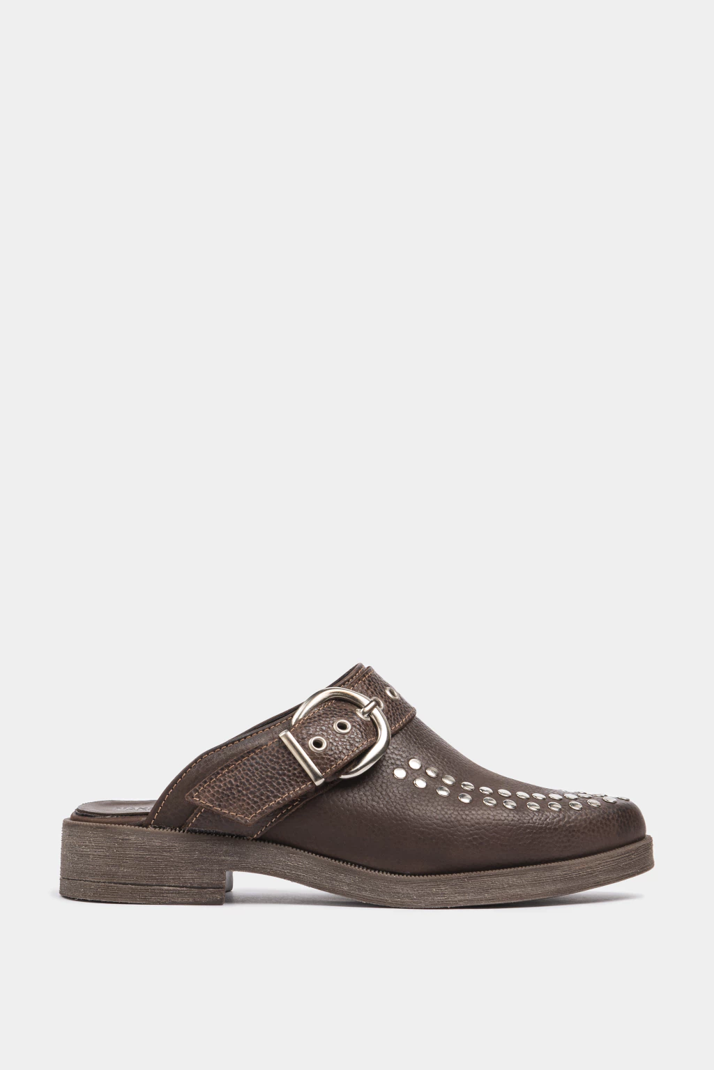 Zueco cerrado de cuero chocolate con detalle de tachas en la capellada. Tira con hebilla metálica en el empeine. Base de goma con taco de 3 cm en la parte trasera y 1,5 cm en la delantera. Diseño cómodo y fácil de calzar.